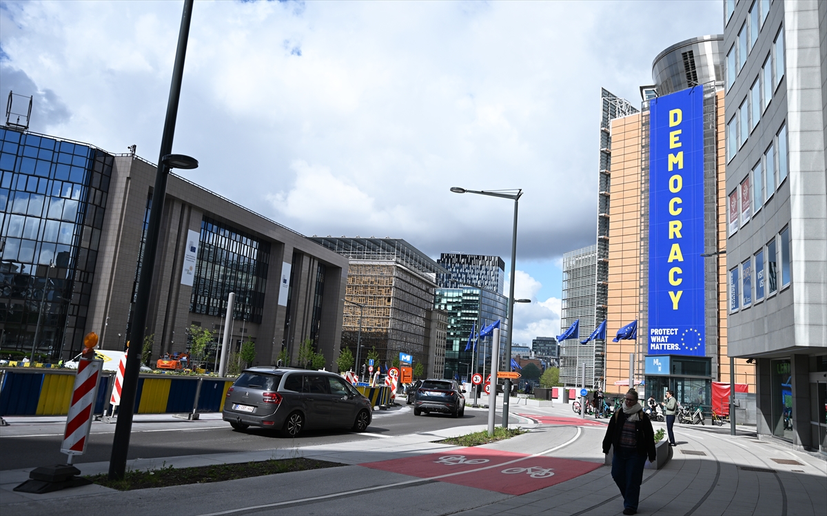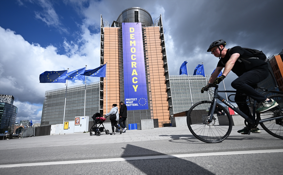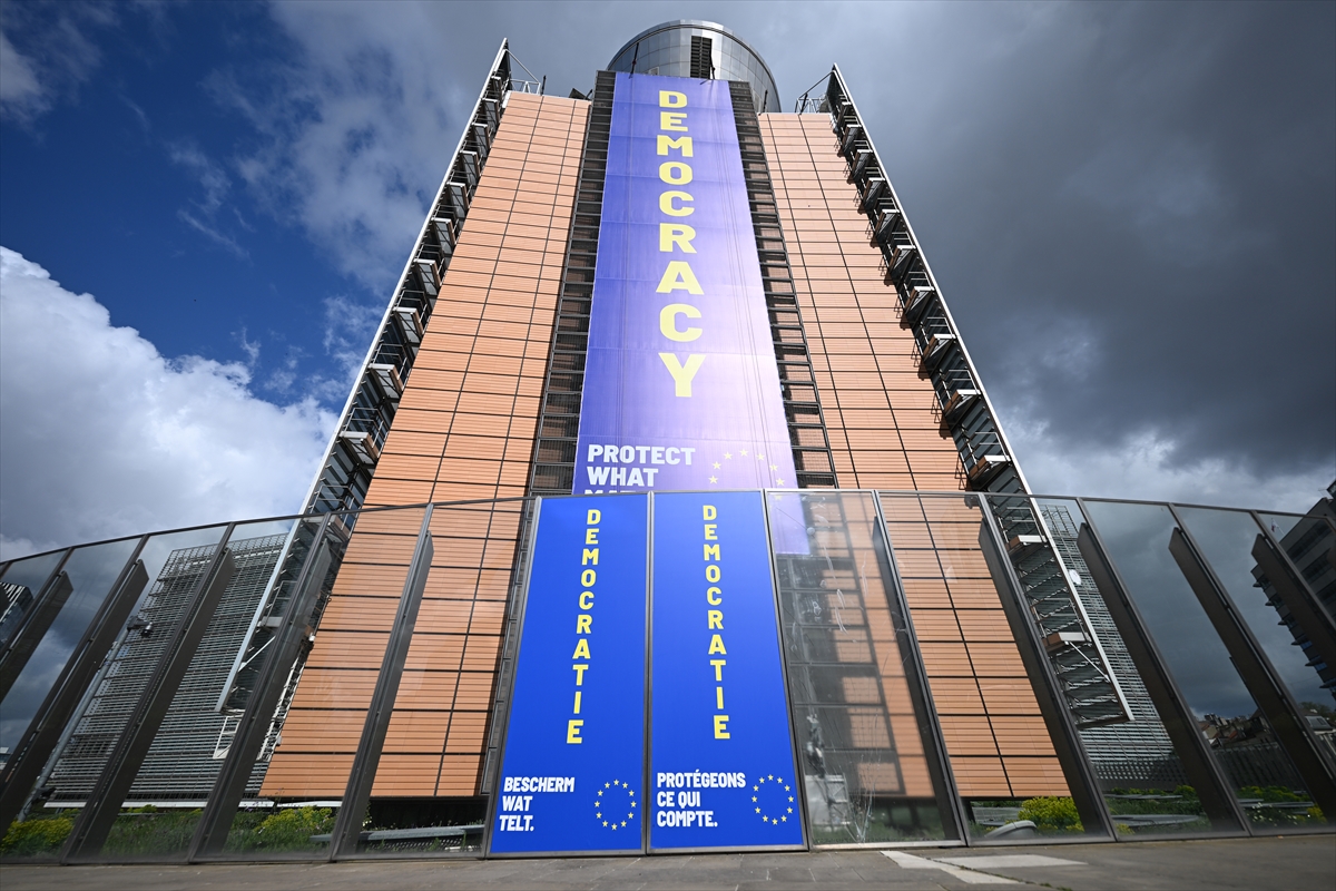 Avrupa Birliği (AB) Komisyonu’nun Brüksel’deki merkezi Berlaymont Binasına Demokrasi (DEMOCRACY) yazılı pankartının illüstrasyonu asıldı.