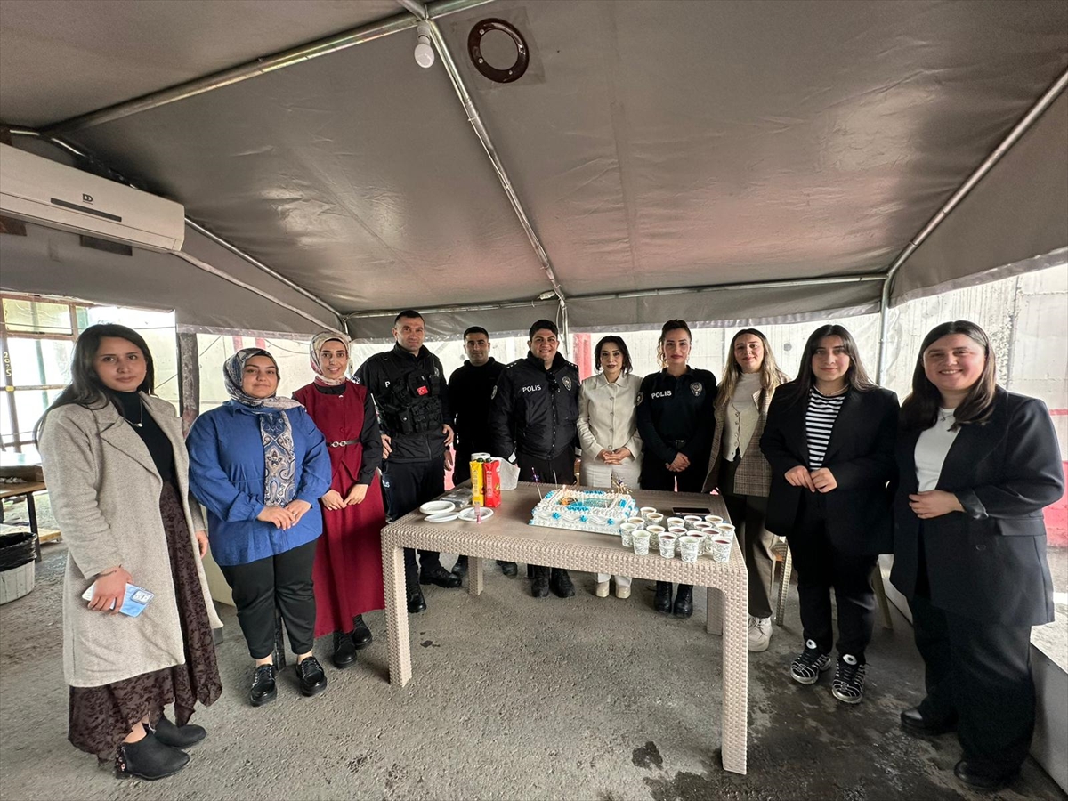 Şırnak’ın Silopi ilçesindeki Aile Destek Merkezinde (ADEM-1) faaliyet yürüten kadınlar, Türk Polis Teşkilatının 181. kuruluş yıl dönümü ve Polis Haftası dolayısıyla görevi başındaki polis ekipleri için sürpriz kutlama yaptı. ADEM-1 Koordinatörü Aylin Ökten ve merkezde faaliyet yürüten kadınlar, ilçe girişindeki güvenlik noktasına giderek polis ekiplerinin gününü kutladı. Kadınlar, beraberlerinde getirdikleri, üzerinde Emniyet Genel Müdürlüğü logosu bulunan pastayı polis ekiplerine verdi. Pastanın üzerindeki mumları üfleyen polis ekipleri, daha sonra pastayı keserek ziyaretlerinden dolayı kadınlara teşekkür etti. Ökten, yaptığı açıklamada, Türk Polis Teşkilatının 181. kuruluş yıl dönümü ve Polis Haftası’nı kutladıklarını belirterek, emniyet mensuplarını bu özel günde unutmadıklarını göstermek istediklerini söyledi. Ökten, “Huzur ve güvenliğimizin teminatı olan emniyet teşkilatımızın her bir ferdine şükran ve minnetlerimizi sunuyoruz.” ifadesini kullandı. Ökten ve beraberindekiler daha sonra İlçe Emniyet Müdürü Ali Yakut’u makamında ziyaret etti, polis haftasını kutladı. Kadınlar, Yakut’a el sanatları kursunda filografi sanatıyla hazırladıkları polis teşkilatı logolu tablo hediye etti. İlçe Emniyet Müdürü Yakut, ziyaretlerinden dolayı kadınlara teşekkür etti.